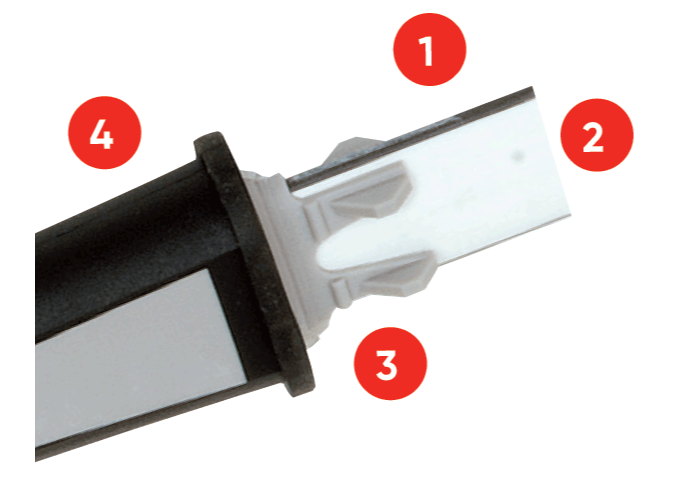 - Polypropylen, um dem Griff Form zu geben und einen Teil der Aufprallenergie zu dämpfen.