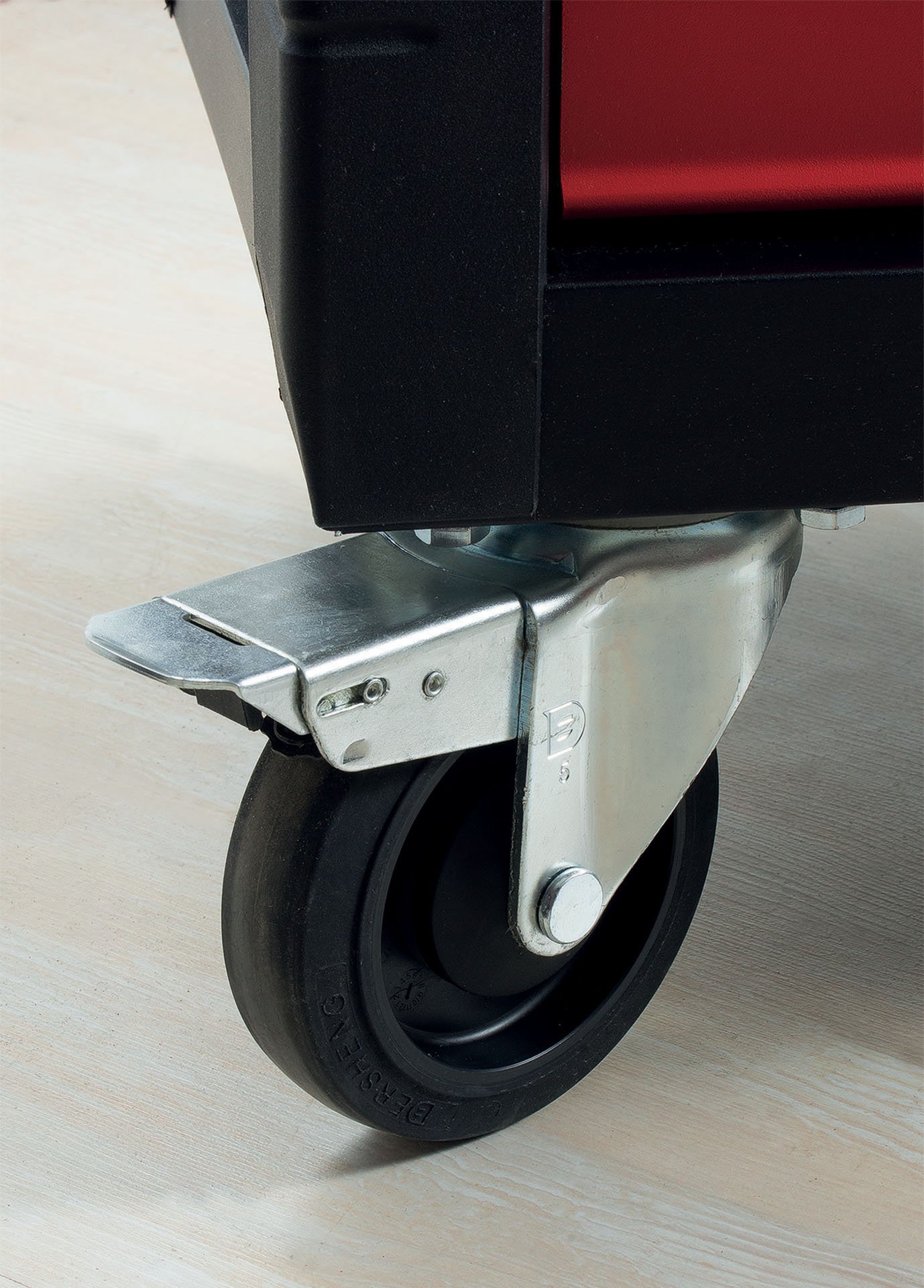 Die Polyurethanräder mit einem Durchmesser von 125 mm erleichtern das Bewegen des Wagens. Sie sind flexibler, lassen sich leichter ins Rollen bringen und sind auch auf unebenem Boden einfacher zu handhaben. Um den Werkzeugwagen dicht an einer Wand oder zwischen mehreren Gegenständen zu positionieren, lassen sich die Räder um 360° drehen. Zwei unserer Modelle sind mit 6 Rädern ausgestattet: 2 Bockrollen und 4 Lenkrollen, von denen eine mit einer Bremse versehen ist. Mehr Mobilität bedeutet weniger Ermüdung am Ende des Tages!