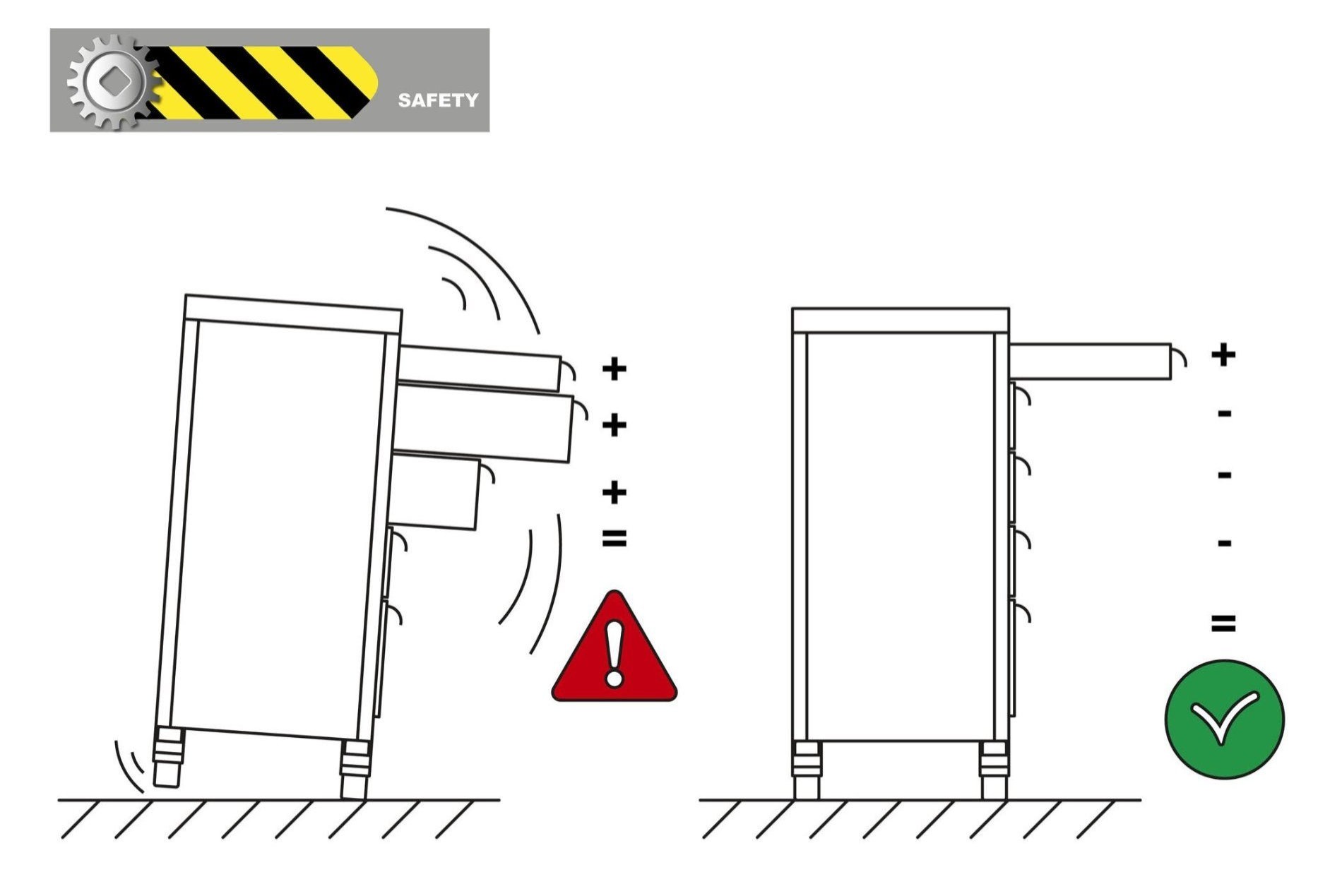 Der Werkzeugwagen XLiner ist mit einem Sicherheits-Kippschutzsystem ausgestattet, das das Öffnen jeweils nur einer Schublade ermöglicht, um ein Umkippen zu verhindern. Dank seiner Zentralverriegelung lassen sich zudem alle Schubladen gleichzeitig mit einem einzigen Schlüssel verschließen.